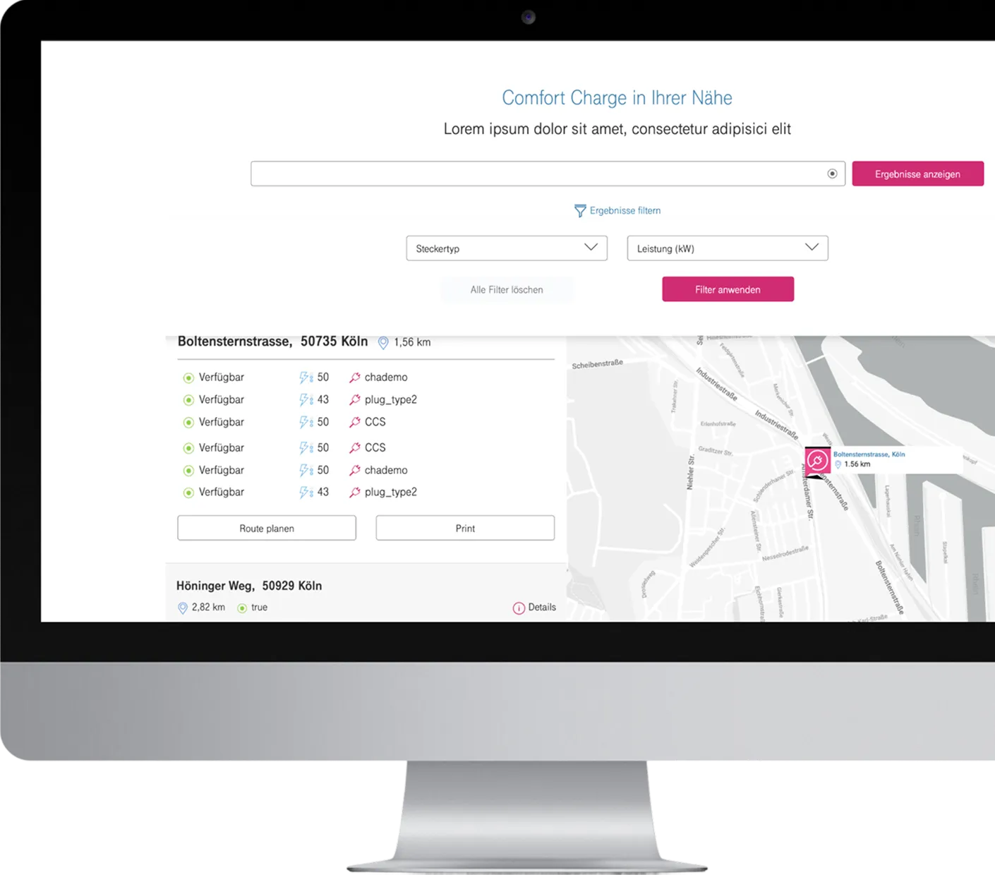 Die wesentliche Herausforderung bestand darin, eine intuitive und leistungsstarke Lösung zu schaffen, die es Fahrern von Elektroautos ermöglicht, schnell und unkompliziert die nächste verfügbare Ladestation zu finden. Wir wurden beauftragt, einen Location Finder zu konzipieren, zu gestalten und zu entwickeln, der durch einfach bedienbare Such- und Filterfunktionen eine nahtlose Nutzererfahrung sicherstellt und so die Akzeptanz der neuen Infrastruktur fördert.